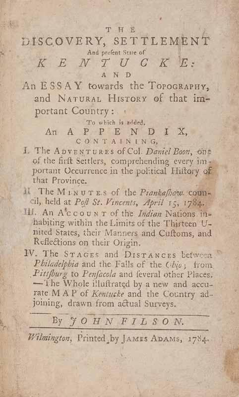 The first book on Kentucky, including the first biography of Daniel Boone, written by John Filson (1784).