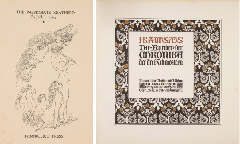 Book highlights from Irmo’s collection include a rare first edition of Die Bucher der Chronica der drei Schwestern, illustrated by Heinrich Lefler and Joseph Urban, considered a “Jugendstil” masterpiece and printed in small edition for the Paris World Exposition of 1900 ($1,000/$1,500); a morocco-bound copy (#188 out of 1,000) in a limited edition of Motte Fouqué illustrated by Arthur Rackham and bearing his signature ($800/$1,000); copy number 7 of 60 of Propertius in Love, translated from Propertius by Jack Lindsay and illustrated by his father Norman Lindsay, signed by Jack and bound in vellum; and a copy of the scarce true first edition of Jack Lindsay’s The Passionate Neatherd, signed by Jack and illustrated by his father. ($2,000/$3,000)