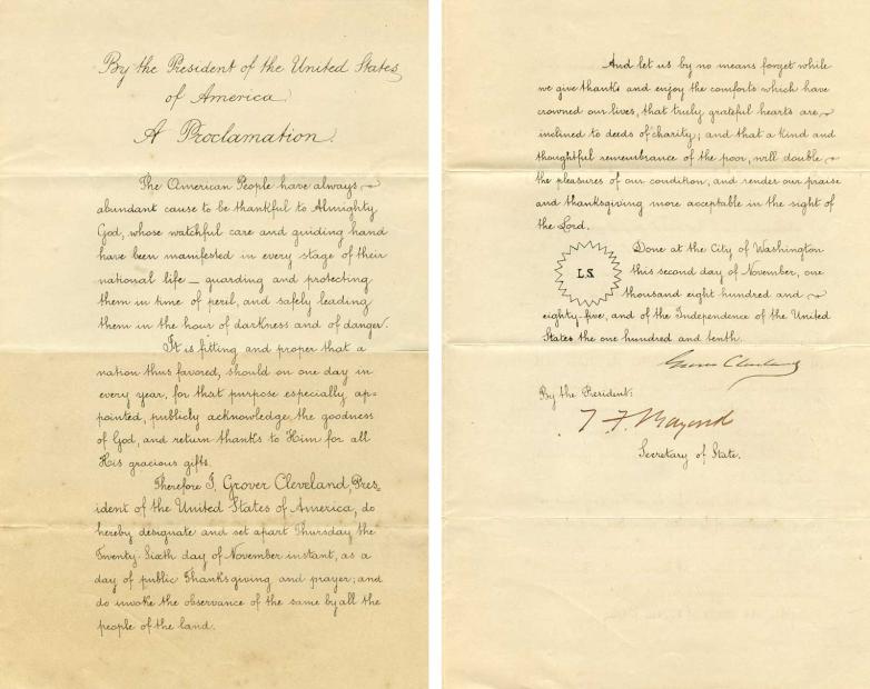Shown here is Cleveland's signed proclamation, declaring, "I, Grover Cleveland, President of the United States of America, do hereby designate and set apart Thursday the 26th of November instant as a day of public Thanksgiving and prayer, and do invoke the observance of the same by all the people of the land." Every president's official proclamation is housed at the National Archives, but presidents often sign extra copies to be distributed to officials. This is one such copy, currently offered by the Raab Collection in Ardmore, PA, for $9,000.