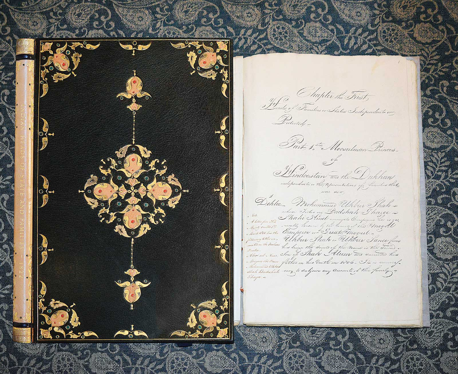 One day he came across a truly astonishing volume: a Calcutta imprint from 1794 in mint condition, bound in a lustrous indigo-blue Indian goatskin binding, with gilt roll tooling around the covers and the entirety of the flat spine consisting of repeated fish and flowers. It was stunning and clearly contemporary with the book’s printing. “I dubbed this unknown binding maestro the ‘Moghul Fish’ binder, as his fish reminded me of the royal insignia used by the rulers of Oude. Years later I found other books bound by the Moghul Fish binder in the same style and books with copies of his distinctive roll tool used on Indian bindings in a more European style.”
