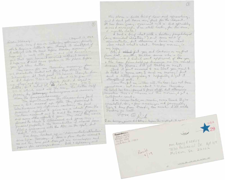 Signed mostly ‘Rick’ and frequently with a smiley-face, they were written from Allenwood Penitentiary, Lewisburg, between 1994 and 2005, mostly on yellow, lined legal paper, and addressed to his sister Nancy Ames Everly. Topics cover his solitary confinement, criticisms of US government agencies, conviction appeal plans, and details of which books and magazines he read.
