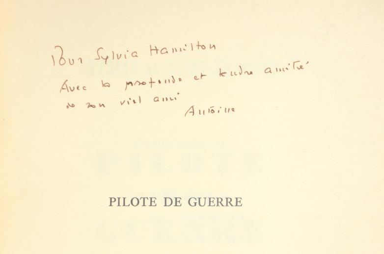 The copy of the 1942 Pilote de Guerre – simultaneously published in English as Flight to Arras – was a gift from Saint-Exupery to Sylvia Hamilton, inspiration for the fox in the book and whose doll was the model for the little prince himself. “Pour Sylvia Hamilton, Avec la profonde et tendre amitié de son vieil ami, Antoine,” he wrote.