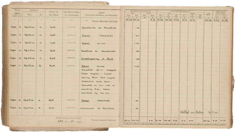 The logbook begins on March 9, 1939, and the final entry is September 14, 1940, when he died after serving more than 429 hours of flying time on D.H. 82, Oxford, Blenheim, Magister, Master and Spitfire.