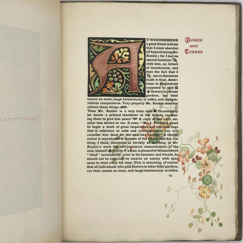 Ruskin & Turner (1896), the sixth book issued by the Press. For this book, the Roycrofters obtained ten photonegatives of Turner masterpieces from the British Museum. But the beautiful watercolor seals the deal for me—flowing into and over the text, throwing it into a kind of relief and drawing attention to the physicality of its printing. Unfortunately, on this occasion the artist didn’t sign her work! Given the publication date, a likely candidate is Bertha Crawford Hubbard, Elbert’s first wife, who oversaw the illumination studio at this time.