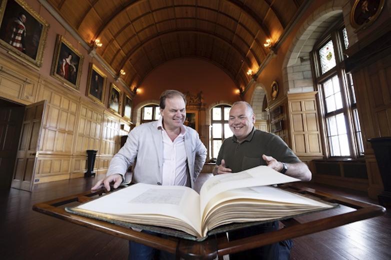 Lord Dalmeny (left) and Professor Gerard Carruthers (right) of the University of Glasgow at Barnbougle Castle looking through the Burnsiana book.