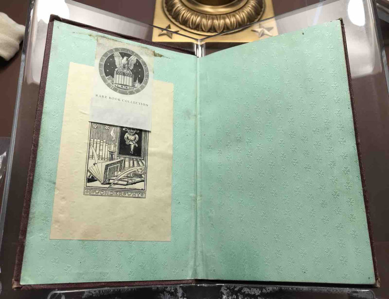 The bookplates of both Carolyn Wells (under) and the Library of Congress (over) in a first edition of Walt Whitman’s Memoranda of the War that Carolyn bequeathed to the library upon her death in 1942.