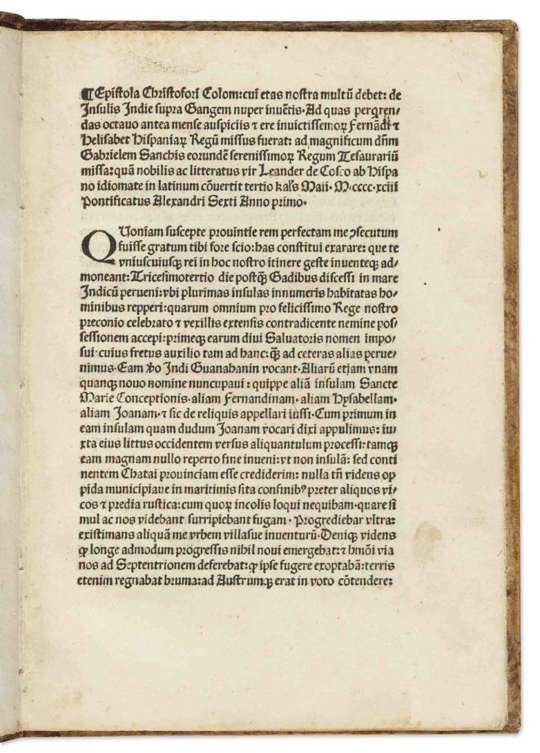 The Epistola de insulis nuper inventis, the earliest obtainable edition of Christopher Columbus’s letter to King Ferdinand and Queen Isabella announcing his “discovery” of the American continent, has been sold for $3,922,000, 392 percent of its low estimate.