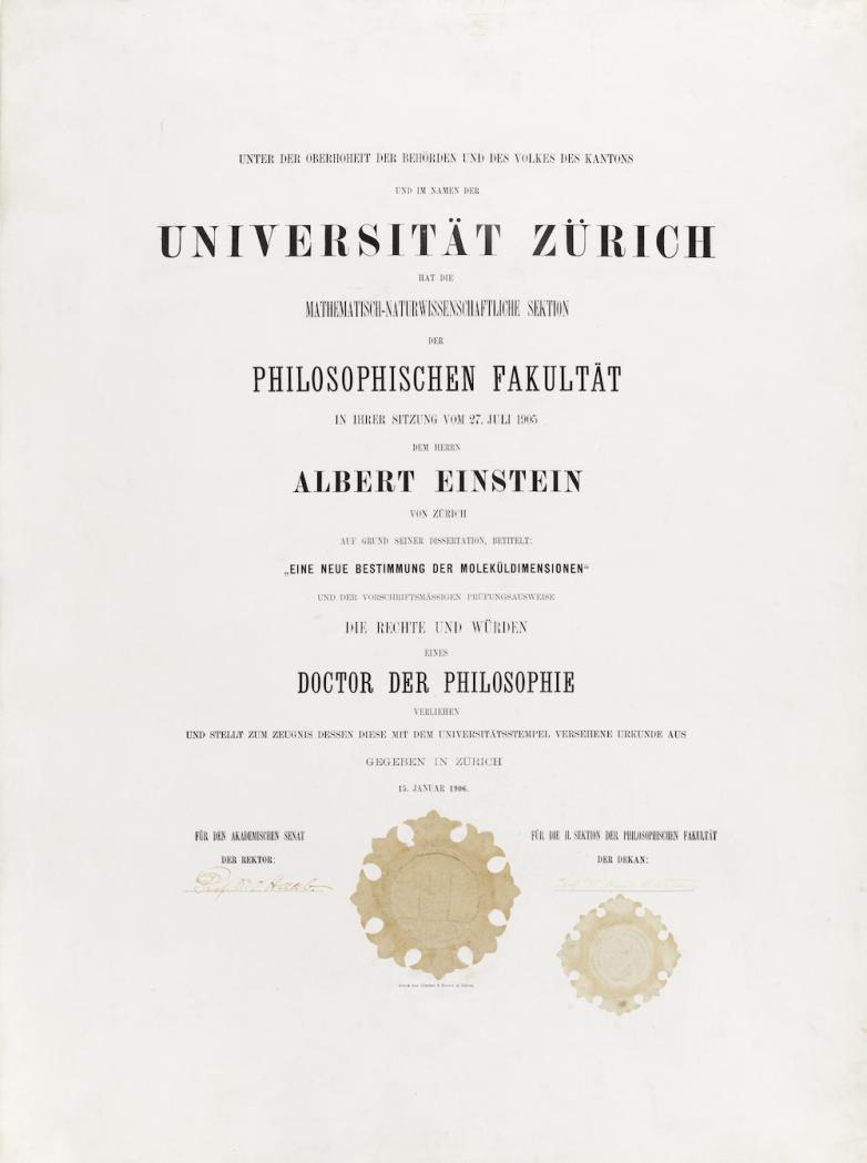 Ian Ehling, Bonhams Director of Fine Books and Manuscripts in New York, said, “Einstein’s doctoral certificate for his important paper on calculating molecular dimensions, now the most cited of all of his writings, stands as a fantastic reminder of his genius and the cornerstone of his academic and research career which profoundly affected the way we view our world and the cosmos.”