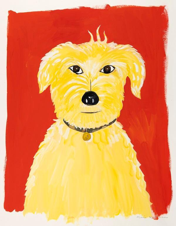 With an idiosyncratic style all her own, Kalman employs compressed space, unpredictable pacing, and often shocking colors to keep readers on their toes. Her first children's book was Stay Up Late (1987), in which she gave visual form to a famous Talking Heads song. She's collaborated with other writers, including U.S. Senator Kirsten Gillibrand on Bold & Brave: Ten Heroes Who Won Women the Right to Vote (2018), food writer Barbara Scott-Goodman for Cake (2018), and children's book author Lemony Snicket on 13 Words (2010). Paintings from all three books are represented in the exhibition. Kalman also loves dogs and explains her fascination with them in Beloved Dog (2015). (Viewers who look closely will find dogs amongst the array of characters in her books.)