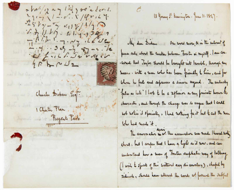 On display in the museum until October is a letter in this shorthand to fellow novelist William Makepeace Thackeray dated June 1847. It is in reply to a letter from Thackeray in which Dickens attempts to defuse an argument between Thackeray and Dickens’s close friend John Forster.