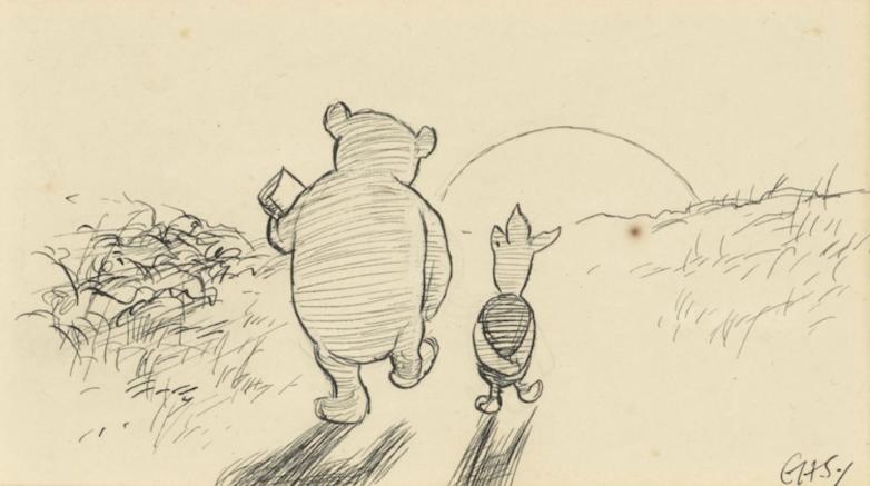 Described by Bonhams  as “arguably the most important Winnie-the-Pooh drawing in existence”, it shows the two friends walking home after Christopher Robin’s party for Pooh in the Hundred Acre Wood.