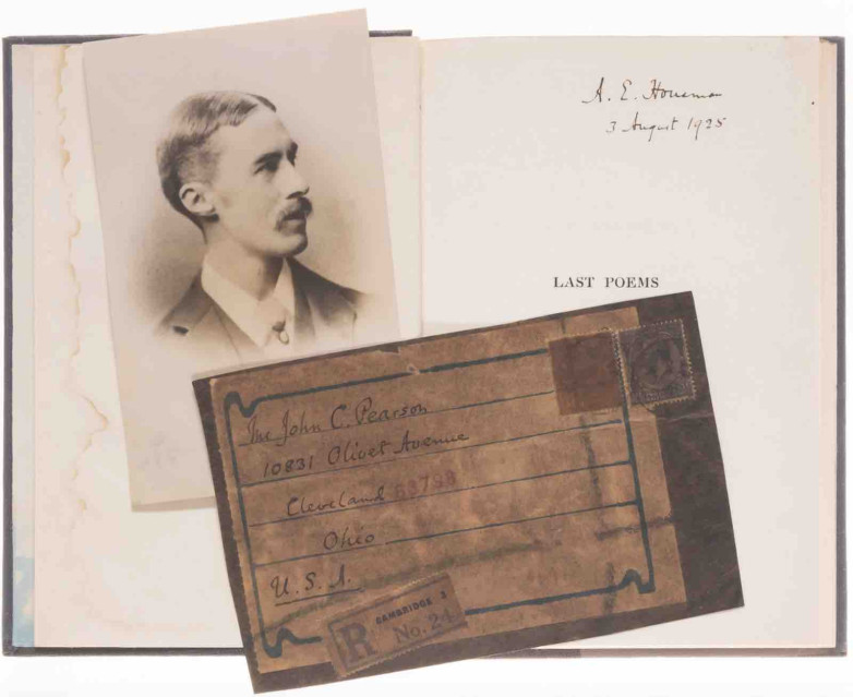 First edition (Grant Richards Ltd, 1922), first issue, signed by the author to John C. Pearson dated "3. August 1925", original mailing label addressed to John C. Pearson, Ohio, in the author's hand, and a postcard with the author's photograph laid in. Housman's only work to include First World War poetry.