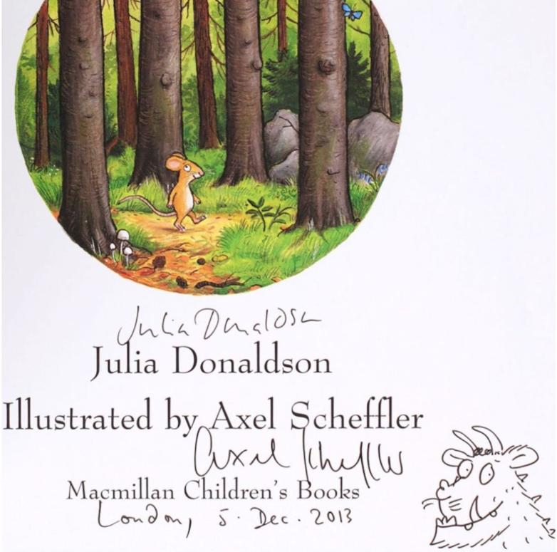 First gift edition, signed by Donaldson and Scheffler, with a sketch of the Gruffalo's head.  2007.