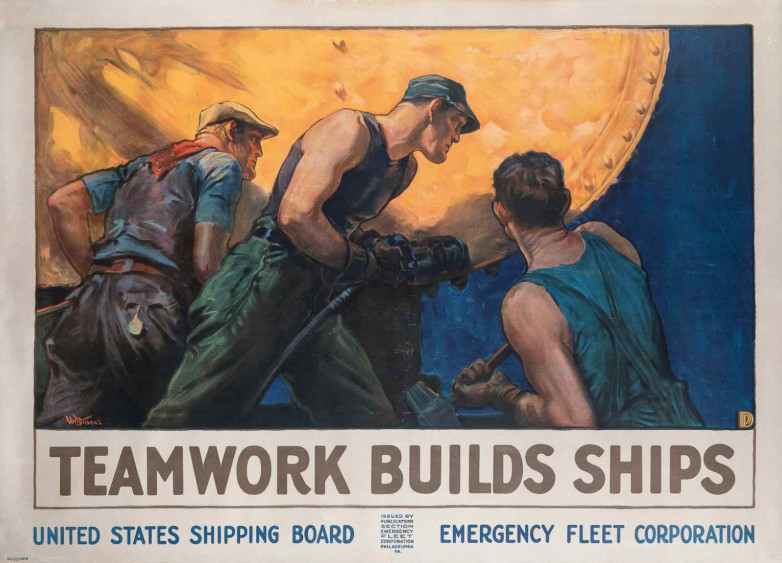 Teamwork Builds Ships, color lithograph poster by William Dodge Stevens