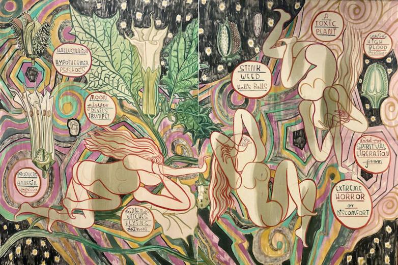 The London-based visual artist Emma Talbot presents 21st-Century Herbal, a painted silk hanging that is her take on medieval manuscripts, specifically herbals, which describe plants and their properties. She was inspired by the infamous Voynich Manuscript, she says in a short video produced by Frieze. “I wanted to make a 21st-century version which would explore and explain the properties in plans that are quite magical or medicinal.”
