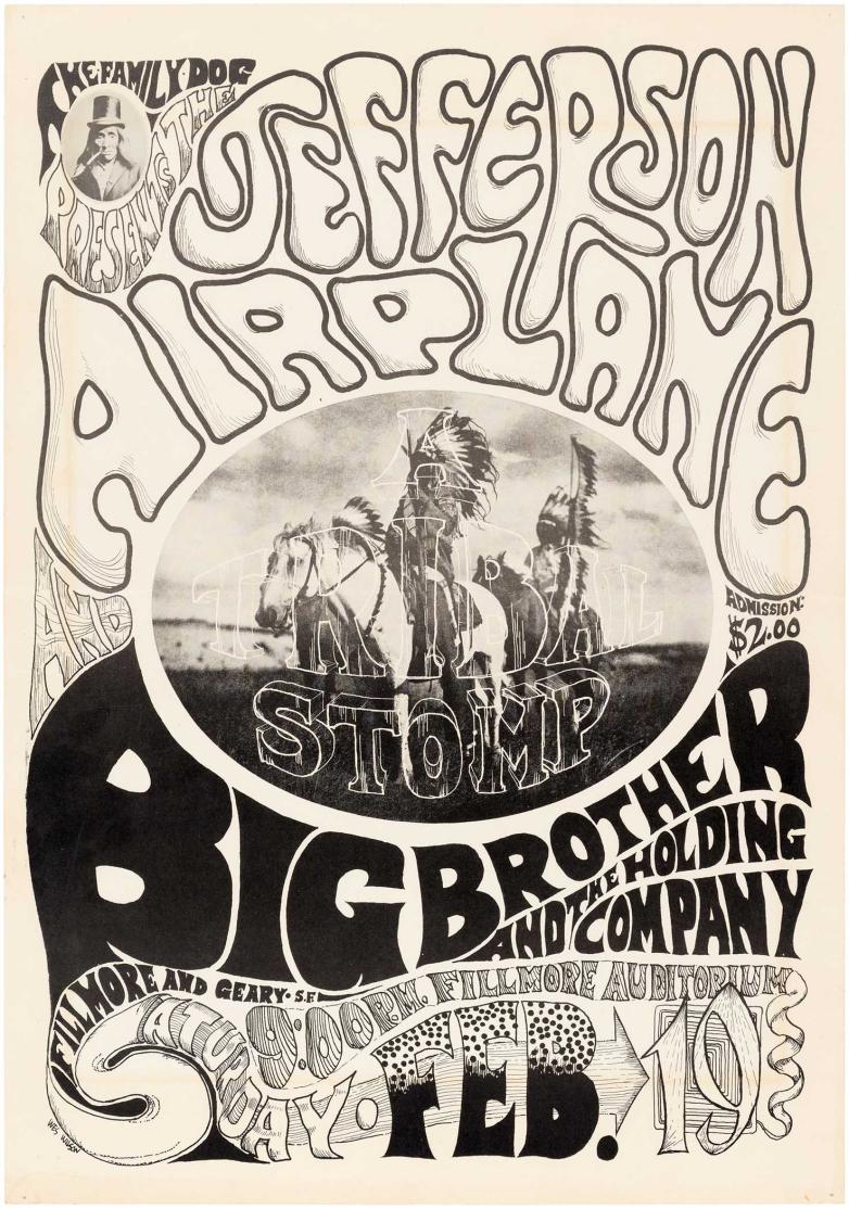 First printing of poster promoting the Feb. 19, 1966 launch of iconic San Francisco hippie music venue The Family Dog, starring Jefferson Airplane and Big Brother & the Holding Company. Estimate $20,000-$35,000