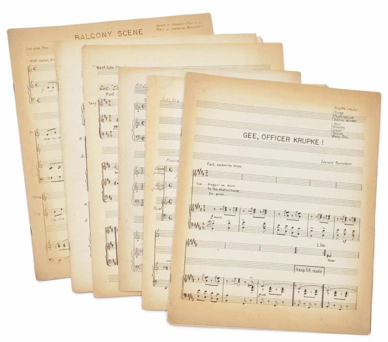 • photo-reproduced rehearsal scores for six songs from West Side Story, with occasional notes in black and red pencil.