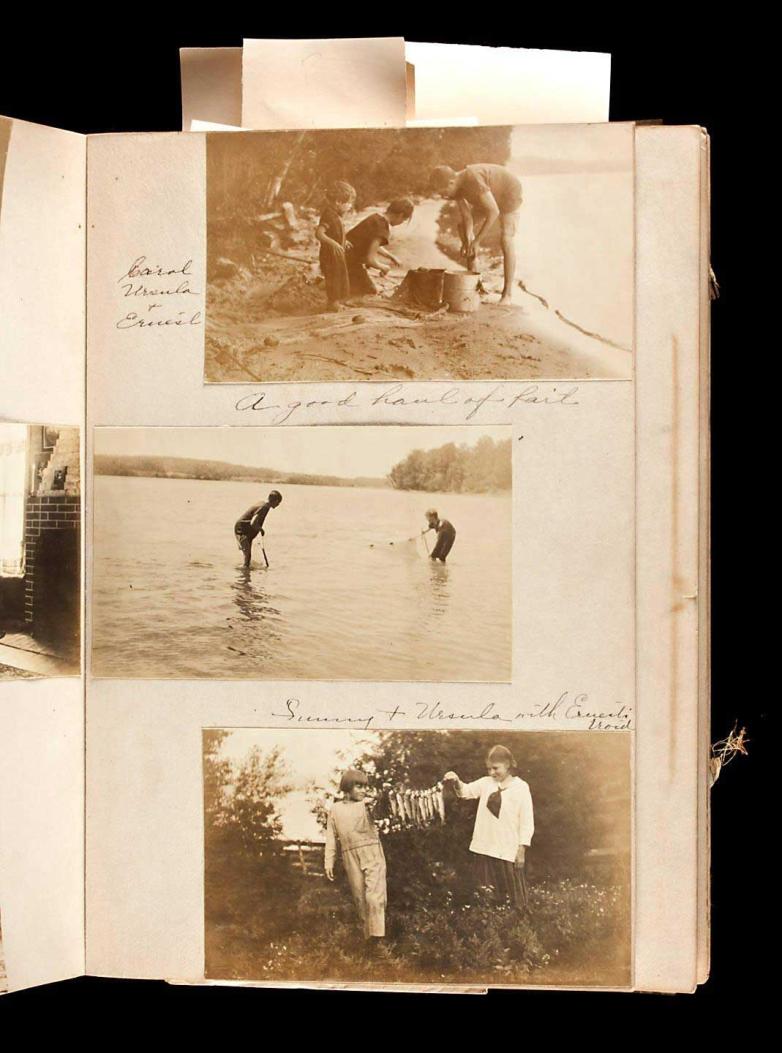 The Hemingway family's photos aren't so different from a modern family's vacation shots—images of children playing, family dinners, group portraits. Many of these were taken at the Walloon Lake summer house in Northern Michigan, a haven for the Hemingway family. Young Ernest features in 21 of the images. In the page seen here, the top photo shows "July 21, 1913—Ernest's birthday," and he is seen fishing at bottom left. Other memorabilia, including a printed birth announcement for Leicester Hemingway, recital programs, postcards, letters to Ursula, and about thirty pieces of original art drawn by Ursula, are contained within in the flexible morocco binding.