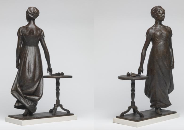 The commission has been awarded to leading sculptor Martin Jennings whose previous literary works include the statues of former Poet Laureate John Betjeman at St Pancras railway station in London, poet Philip Larkin in Hull, and George Orwell at BBC Broadcasting House in London . It will show Austen in her characteristic ringlets and cap, standing by her writing table. Jennings says he has represented her rising from her table at Chawton as someone arrives at the door, moving in front of her work as if to disguise it. "It is important for me that she should be accompanied by the tools of her trade, so that she is indissolubly associated with her working life," he said.