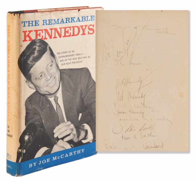 Highlights of the Kennedy-related material include a 1960 first edition of The Remarkable Kennedys which offers a glimpse into the Kennedy legacy and is signed by 11 family members, including Joseph P. Kennedy, President John F. Kennedy, and his wife Jacqueline, Robert F. Kennedy, and Ted Kennedy. Also included is The Peace Corps Act page signed by JFK. This signed page from the pioneering Peace Corps legislation was presented to Bill Moyers and has been in the possession of the Moyers family since its signing in 1961.