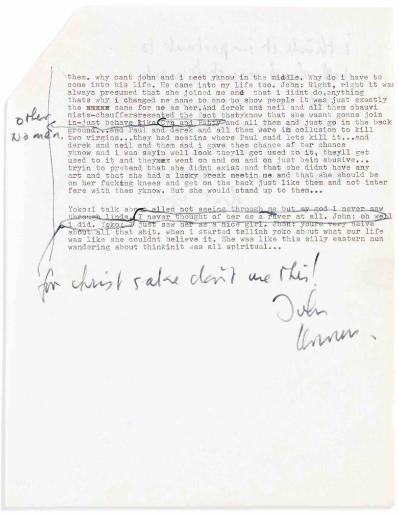 Typescript signed transcription of Robert Schonfeld and Peter McCabe's interview with Lennon and Ono from August 31, 1971, which appeared in the September 1984 issue of Penthouse magazine and which provided source material for Schonfeld and McCabe's books, Apple to the Core (1972) and John Lennon: For the Record (1984). Signed after the typed text  where a comment refers to a circled passage about Linda McCartney: "[F]or [C]hrist['s] sake don't use this!" Sold at Swann Galleries for $19,050 following an estimate of $6,000 - $9,000.