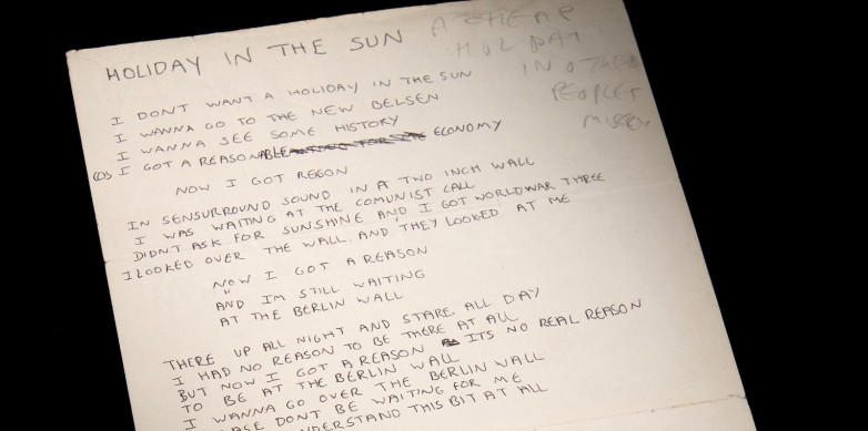 Written in black and green ballpoint pen on both sides of the manuscript, the lyrics include the complete early draft of Holidays in the Sun on one side and an early version of Submission on the other. They were previously exhibited at the Rock & Roll Hall of Fame and Manchester's Urbis exhibition.