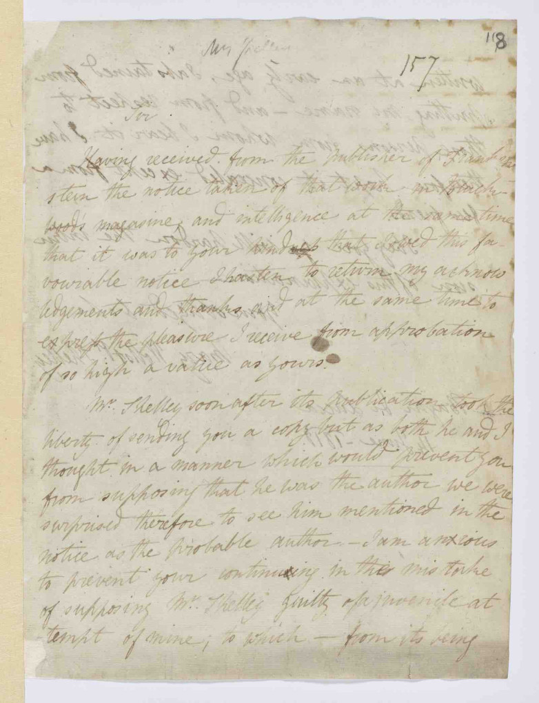 Letter from Mary Shelley to Sir Walter Scott on the authorship of Frankenstein dated June 14, 1818