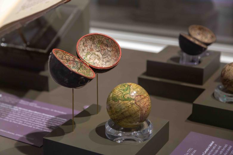 Miniature globes on display in the exhibition, Open New Worlds.