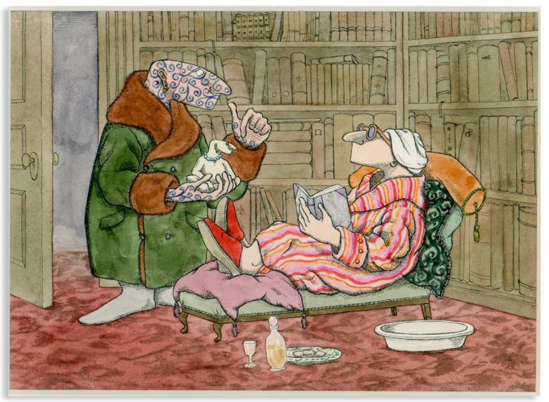 This Edward Gorey original artwork, rendered in pen, ink and watercolor is informally titled ''Tattooed Man and Associate.’’ This charming, somewhat absurdist artwork by Gorey was likely completed in the early 1950s, showing a man covered in swirly tattoos speaking to his companion in the library, with amusing touches such as the man holding a miniature person or statue, and a chamber pot next to the reclined reader.