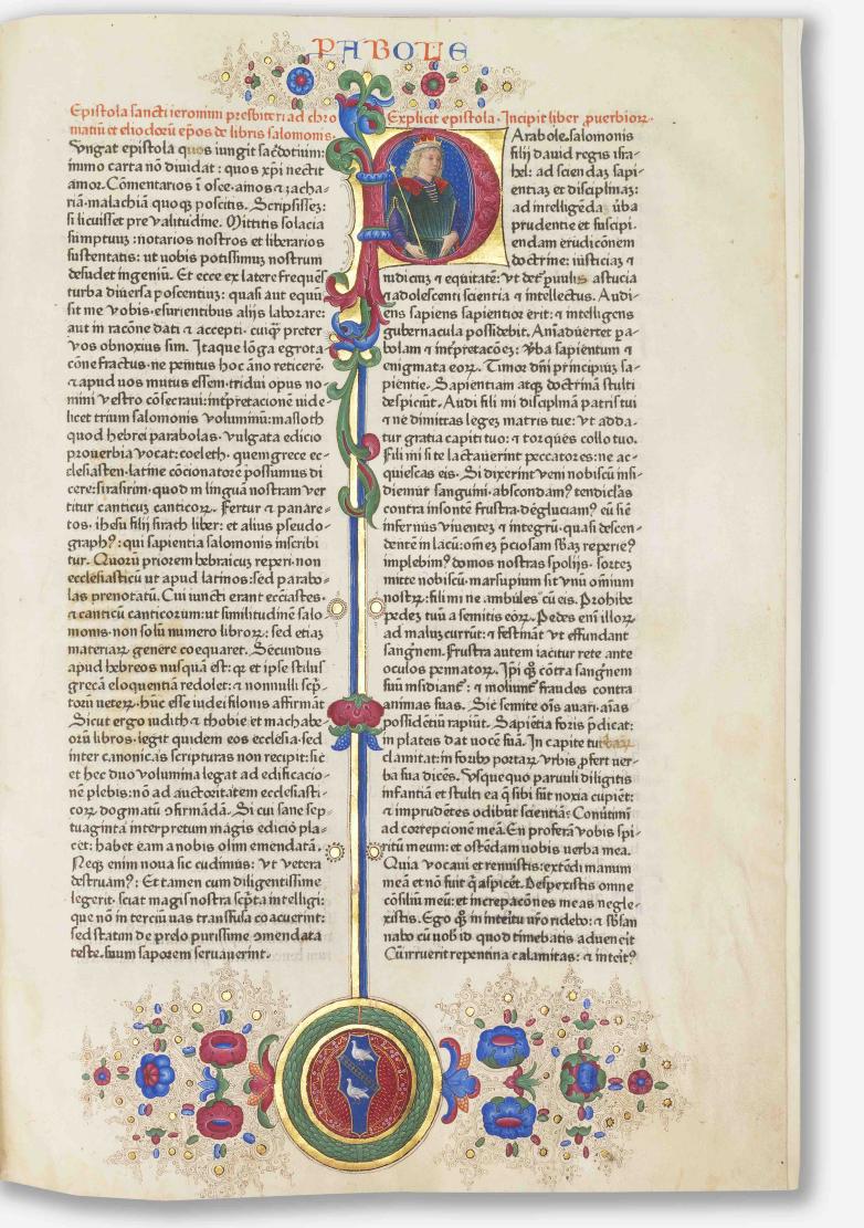 Even apart from the Gutenberg connection, this rare, complete bible, printed on parchment and beautiful illuminated, holds a special place in printing history. According to the auctioneer, “Not only is this the finest work from the first decades of book printing, it is a very special gem, as it is the first book ever to contain a printing device: The alliance signet of Fust & Schöffer is the archetype of the publisher signet. On top of that, the well-legible Gotica-Antiqua type was used in the Fust-Schöffer Bible for the first time ever.”