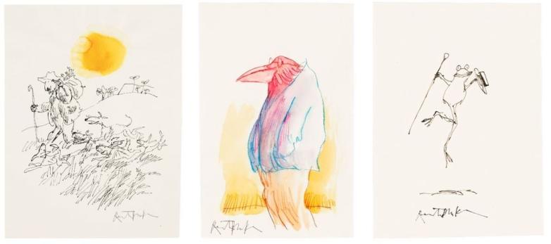 Left to right: Quentin Blake’s “Sunshine Traveller’s #1,” 2020, pen, ink, watercolor paper, signed. Estimate £700-1,000; Quentin Blake’s “Birds as people #6,” watercolor pencil, watercolor paper, signed. Estimate £500-800; Quentin Blake’s “The Dancing Frog,” 2019, pen, ink, watercolor paper, signed. Estimate £500-800