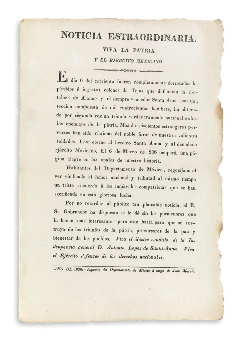An 1836 broadside announcing the fall of the Alamo, printed at Mexico City and offered at Swann Galleries this week.