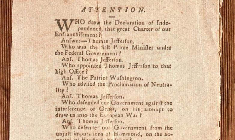 The pro-Jefferson text takes the form of a catechism and poses ten questions to its reader and offers ten answers in turn. It casts Adams and his Federalist colleagues as monarchists and “miscreants” and informs its audience that it was Jefferson who wrote the Declaration of Independence, not commonly known at the time. Described as “one of the most economical and effective pro-Jefferson texts produced anywhere in 1796” by historian Jeffrey L. Pasley, this handbill “taught the gospel of Thomas Jefferson as it would be passed down for generations.”