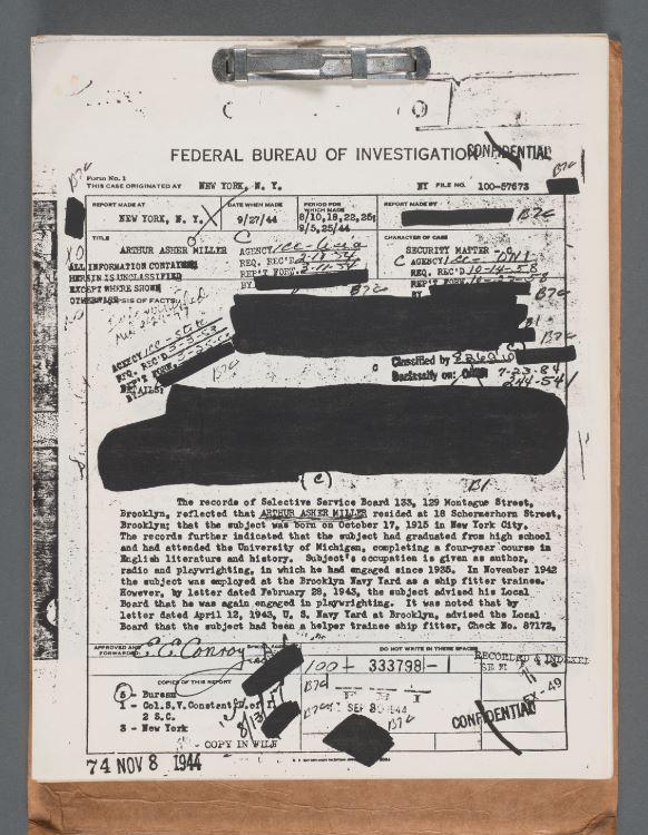 Federal Bureau of Investigation records on Arthur Miller, 1985. Arthur Miller Papers, Harry Ransom Center.