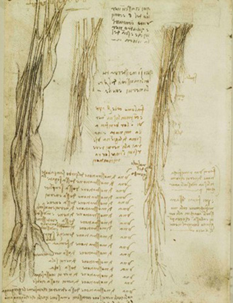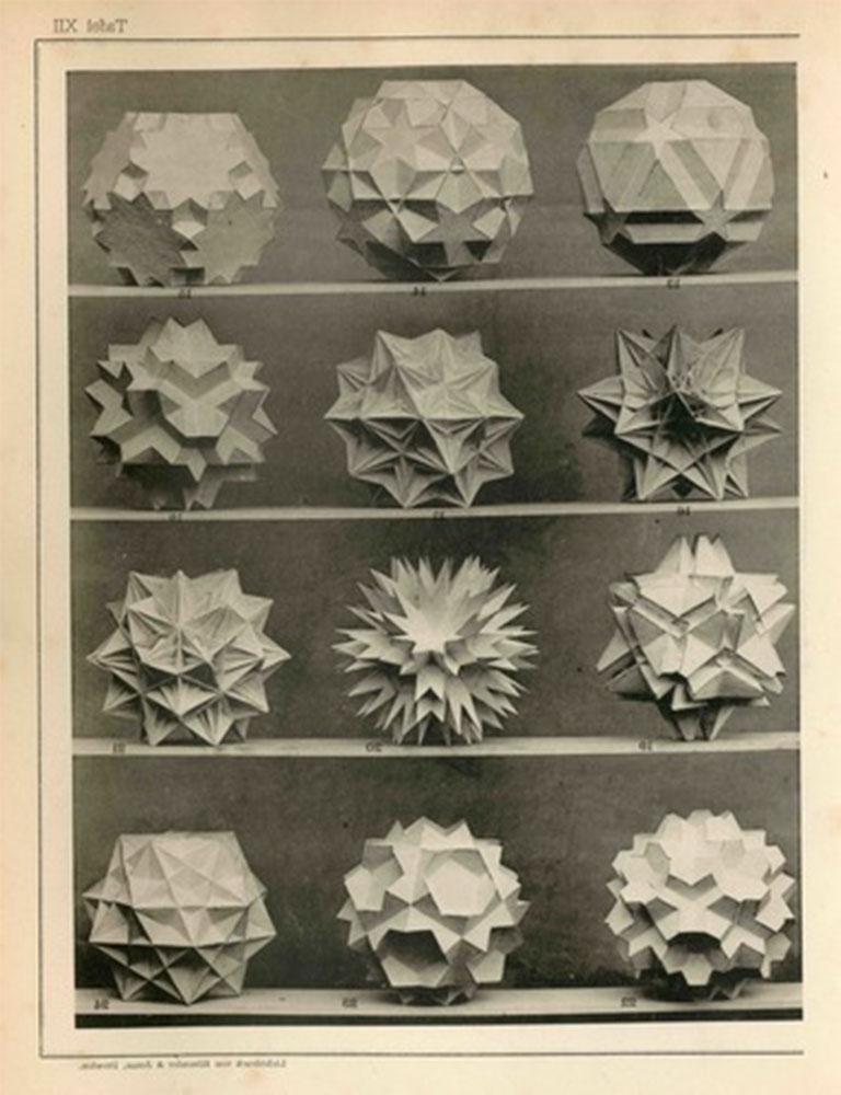 Max Brückner's polyhedral models in the book Polygons and Polyhedra: Theory and History (Vielecke und Vielflache: Theorie und Geschichte) by Max Brückner, 1900. Image credit: Bodleian Libraries, University of Oxford. (Middle) Leonardo da Vinci's sketch of an arm, from the working notebooks of Leonardo da Vinci, now in the Royal Collection.
