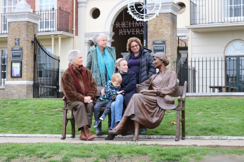 The first full-size bronze statue of Virginia Woolf, by acclaimed sculptor Laury Dizengremel, has been unveiled, in a stunning location on the Upper Terraces at Richmond Riverside by Virginia’s great, great niece Sophie Partridge and Virginia‘s great niece Emma Woolf with her two-year-old son Ludovic Cecil Woolf (Ludo) who got to “meet” his great, great Aunt Virginia!