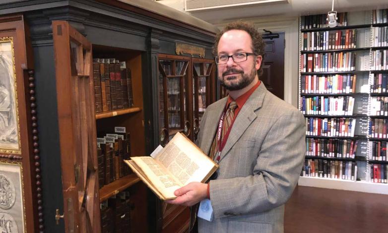 The books circulated from King’s Chapel until the Revolutionary War, when the loyalist clergy fled the city and the library disappeared into safekeeping. It reemerged in the early nineteenth century and was deposited at the Athenaeum in 1823. Fifty years later, the King’s Chapel congregation sponsored the creation of an ark-like Colonial Revival bookcase in which the collection is still housed. All are exceptionally well-preserved and many retain the original bindings Bray commissioned to identify them as part of the library.
