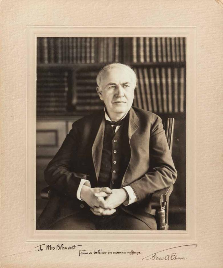 In addition to this and other photographs—including one of Thomas Edison inscribed “to Mrs. Blauvelt from a believer in woman suffrage”—the November sale in Boston will feature significant documents, printed books, natural history prints, and a strong selection of maps.
