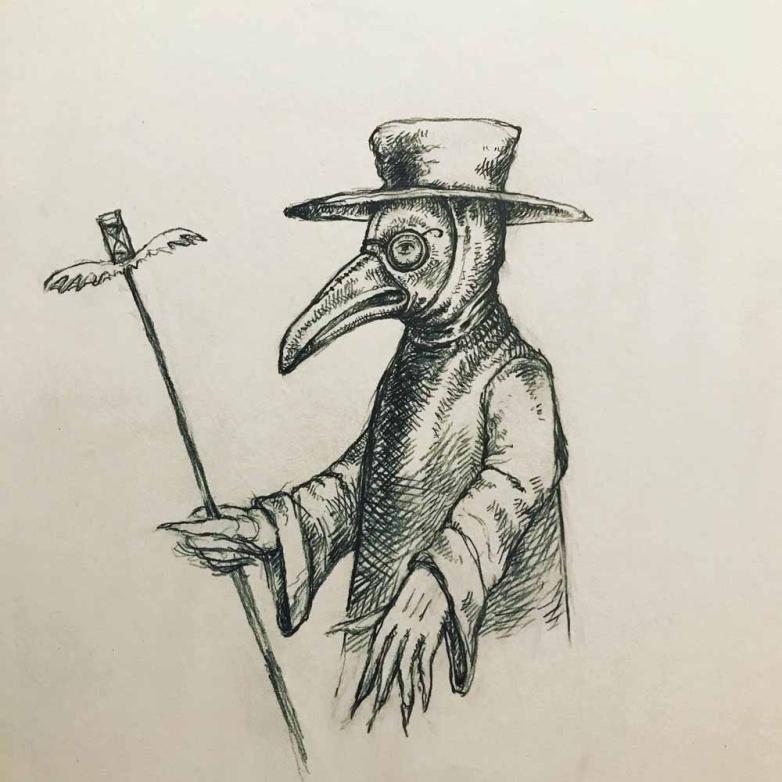 The author/illustrator’s other recent project is called A Drawing A Day, for which he has drawn a picture every day since the pandemic began in March 2020. Seen here is a plague doctor from April.