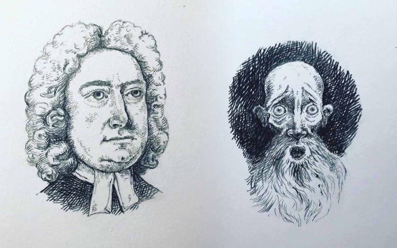 Carey’s drawing for day 257 was Jonathan Swift in honor of the author’s birthday (left) and his version of Geppetto from November (right).