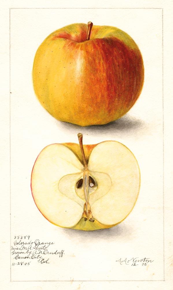 Orchardists Addie and Jude Schuenemeyer use the US Department of Agriculture’s Pomological Watercolor Collection to research heirloom apple varieties, such as the “Colorado Orange” variety from Canon City, Fremont County, Colorado, as drawn by Amanda Almira Nelson in 1905.