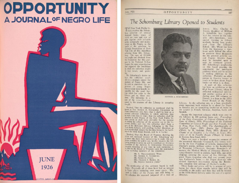 Left: Art by Aaron Douglas on the cover of the June 1926 issue of Opportunity, Journal of Negro Life. Right: An article about Arthur A. Schomburg’s library in the same issue.