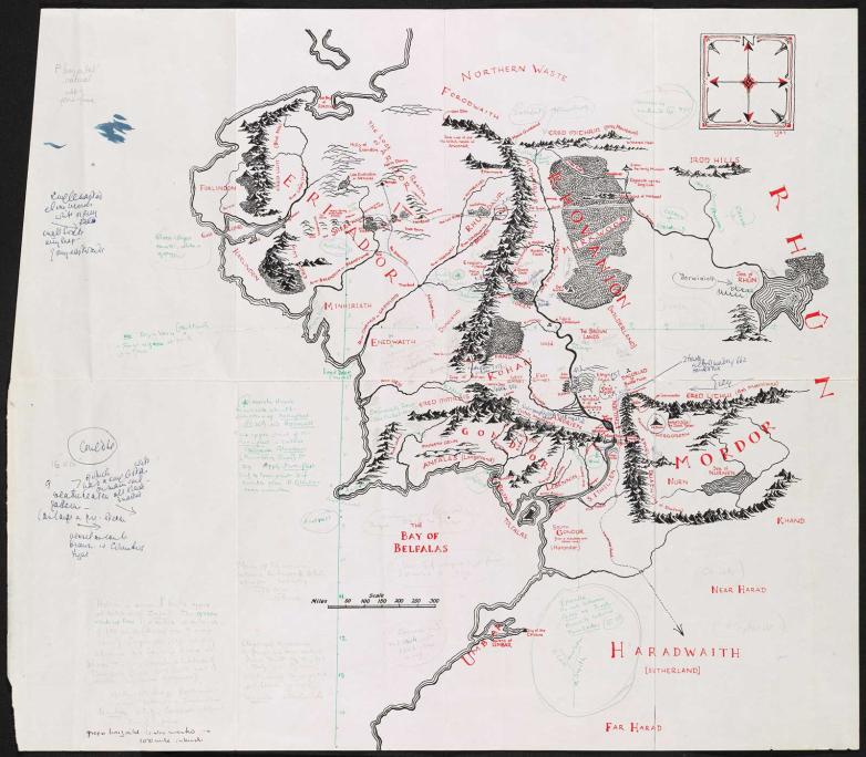 This general map of Middle-earth was included in the first two volumes of The Lord of the Rings, an essential guide for readers navigating through the then-unfamiliar world of Tolkien’s Middle-earth. In 1969 Tolkien collaborated with the artist Pauline Baynes to produce a poster map of Middle-earth. His annotations reveal extraordinary details of his conception of his imaginary world, and its association with the real world. The map reveals that Oxford is on the same latitude as Hobbiton. The recently discovered map was acquired by the Bodleian Libraries in 2016.