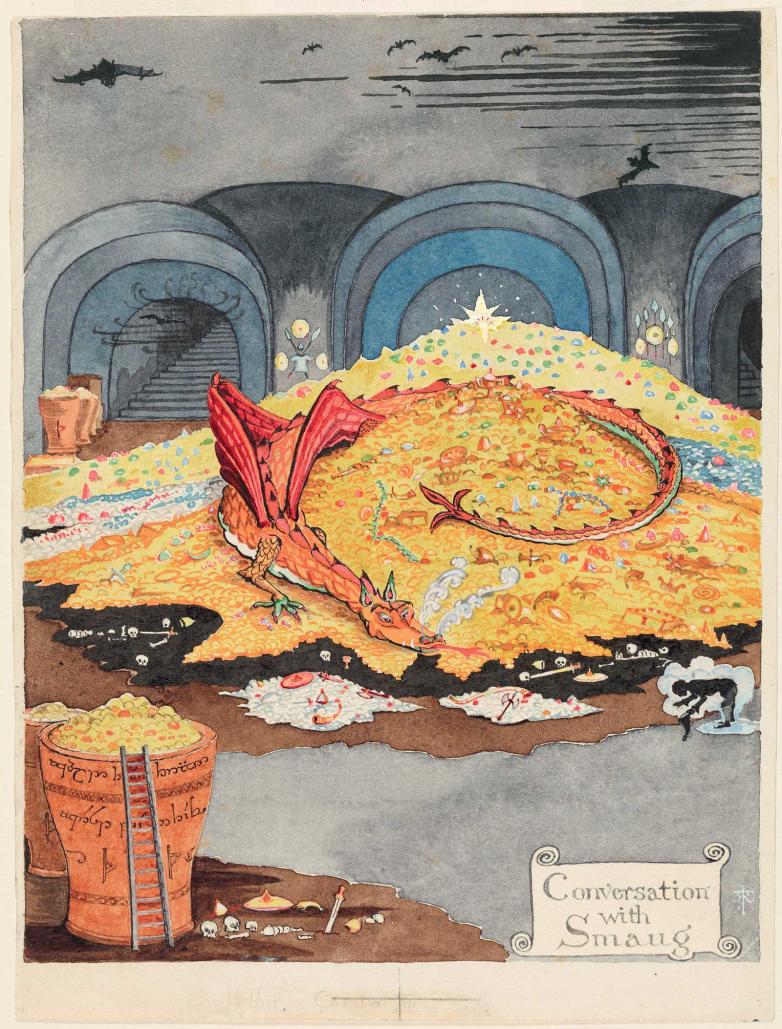 Conversation with Smaug, a watercolor painted by Tolkien in 1937 as an illustration for the first American edition of The Hobbit. In this image, Bilbo Baggins, rendered invisible by a magic ring, converses with the fire-breathing dragon, Smaug.