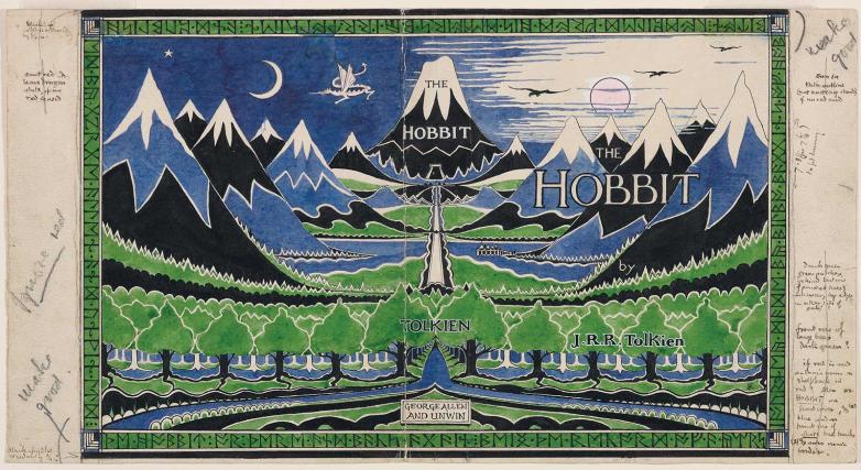 The final design of The Hobbit dust jacket. Tolkien not only illustrated The Hobbit but was also closely involved in its production process, designing the dust jacket and the binding. Tolkien’s notes can be seen around the outside of the image. He was keen to use four colors: green, blue, black, and red, but this was too expensive and the publisher had the final say in the left-hand margin, “Ignore red.”