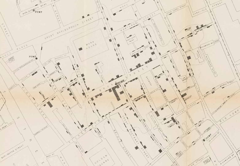 John Snow’s famous dot map showing the distribution of deaths from the 1854 cholera outbreak in the Soho district of West London. Snow was able to show a cluster of victims around the well at the corner of Broad and Cambridge Streets (today’s Broadwick and Lexington).