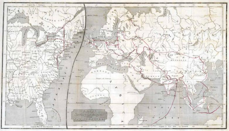 Amariah Brigham’s (1798–1849) map shows the spread of cholera via the trade routes from India (1817) and China (1820) through the Middle East to Europe, Scandinavia, and Britain where it arrived in 1831. The American physician collected his data from other publications and presented his findings in A Treatise on Epidemic Cholera (1832).