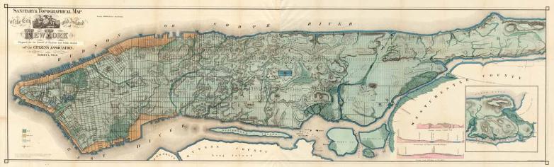 Civil engineer Egbert Viele was among those who continued to believe in the miasmatic causes of disease, even decades after John Snow had proved otherwise. In this 1865 plan (and in its 1874 reissued version), the street grid and sewer system were superimposed over Manhattan’s original topography, waterways, and coastline. Viele used the map to argue for an improvement to the island’s sanitation.