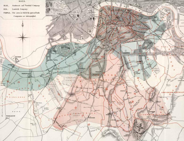 Dr. John Snow used this map to demonstrate that cholera was likely caused by something in the water. London residents supplied with water by the Southwark and Vauxhall Waterworks Company (in green and purple) had a cholera rate fourteen times that of homes supplied by Lambeth Waterworks Company (in red and purple).