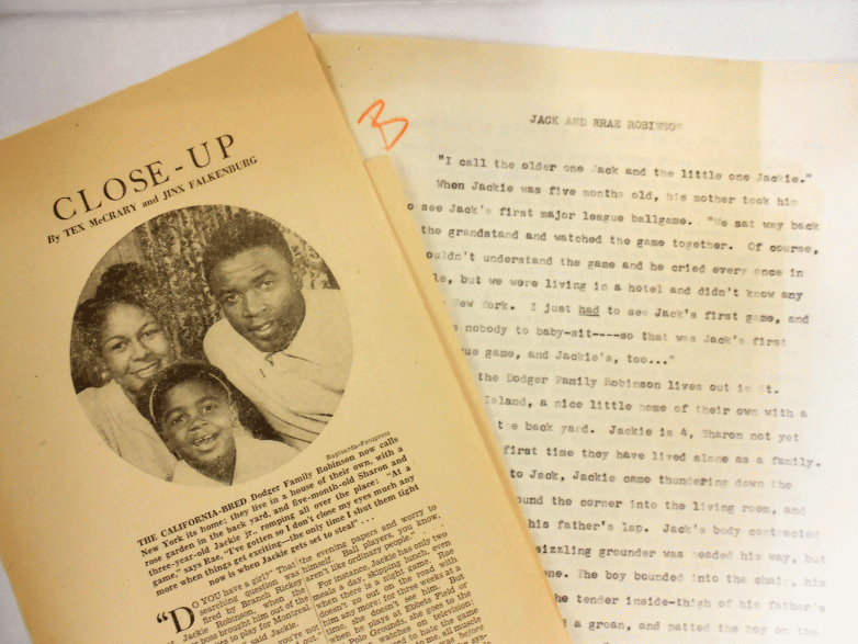 Early in his career, Safire acted as researcher for the New York Herald Tribune, where he interviewed Jackie Robinson for the “Close-Up” column. Seen here are typewritten notes from the meeting with Jackie and his wife Rae along with a copy of the published article.